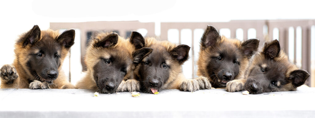 Die Zeit vergeht wie im Fluge. Wir können es gar nicht glauben, aber unsere kleinen Tervueren sind nun bereits 5 Wochen alt. Und es ist erstaunlich zu sehen, wie schnell sich die kleinen Hunde entwickeln. Von Woche zu Woche entwickeln sie sich immer mehr und werden immer agiler. Die Welt wird immer interessanter für sie und sie erkunden alles. Alle Welpen sind furchtlos und neugierig, ohne dabe zu forsch zu sein.