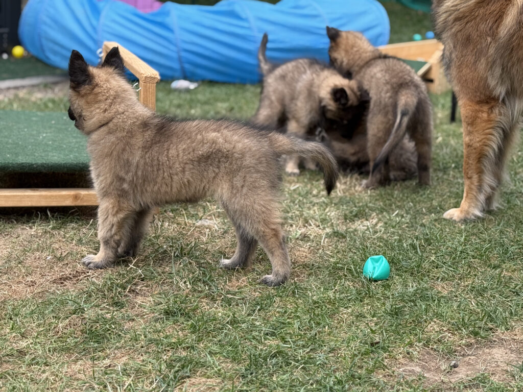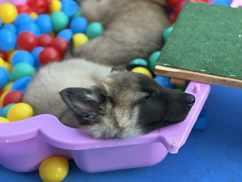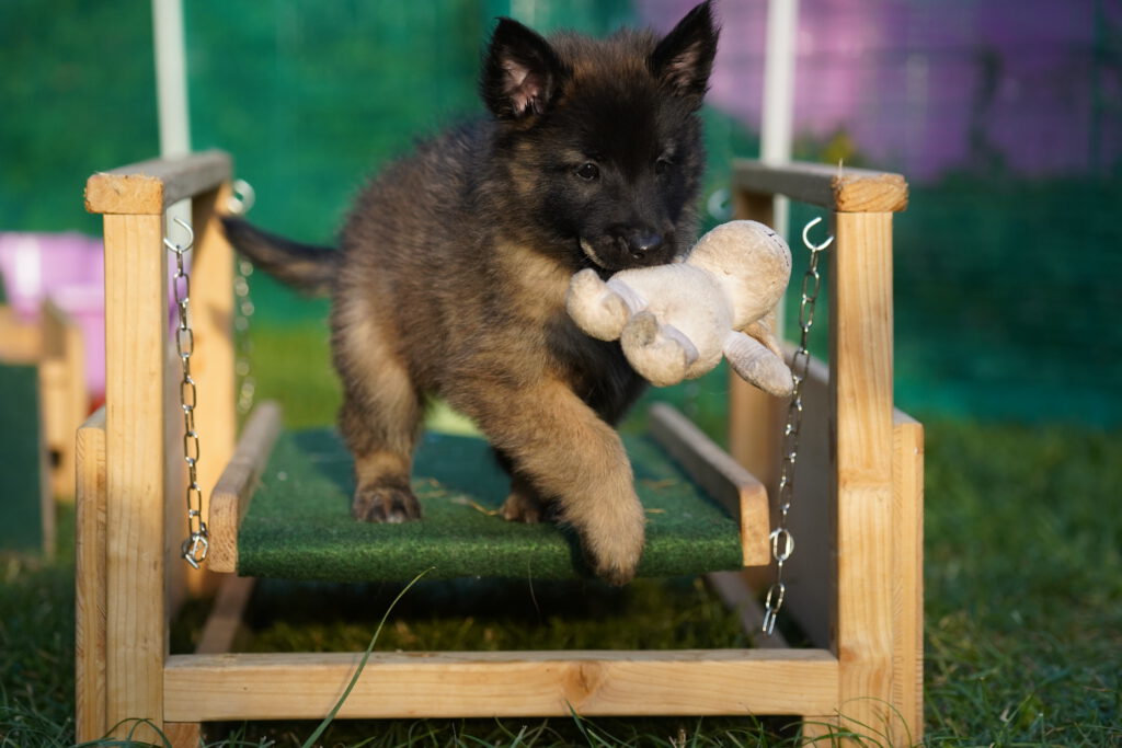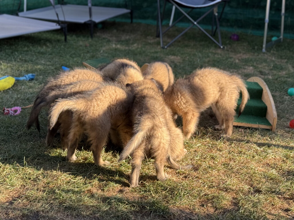 In die Welpen-Zeit hinein fielen natürlich auch ein paar Unternehmungen mit den Welpen, um ihnen nicht nur viele Eindrücke bei uns und mit uns zu vermitteln. So fuhren wir mit den Welpen mehrfach Auto, um sie schonmal daran zu gewöhnen. Wir waren mit Ihnen in einem Fashion Outlet Center, wo sie sie viel „Input“ bekommen haben durch andere Menschen, Musik, fremde Geräusche aber auch andere Hunde. Im gleichen Atemzug lernten Sie den Bahnhof kennen mit abfahrendem Zug. Auch das Fahren in einem Aufzug war für sie neu. Ein anderes Mal gingen wir mit ihnen in den Wald vorbei an einem Pump Track mit Jugendlichen, die mit ihren Fahrrädern dort fuhren. Auch der Sportplatz mit einem gerade stattfindenden Fußballspiel und entsprechender Geräuschkulisse spielte uns hier in die Karten. Im Wald selbst lernten sie neue Gerüche und auch den Waldboden sowie Pferde kennen. Bei diesem Wurf dachten wir dann, dass es eine gute Idee wäre, einige der späteren Welpen-Besitzer mit einzubinden. Einerseits konnten diese so eine Erfahrung machen, die ihnen hoffentlich viel Spaß gemacht hat, andererseits konnten wir helfende Hände gut gebrauchen, denn auf 8 Welpen aufzupassen ist mindestens so schwer, wie auf den vielbeschriebenen Sack Flöhe.