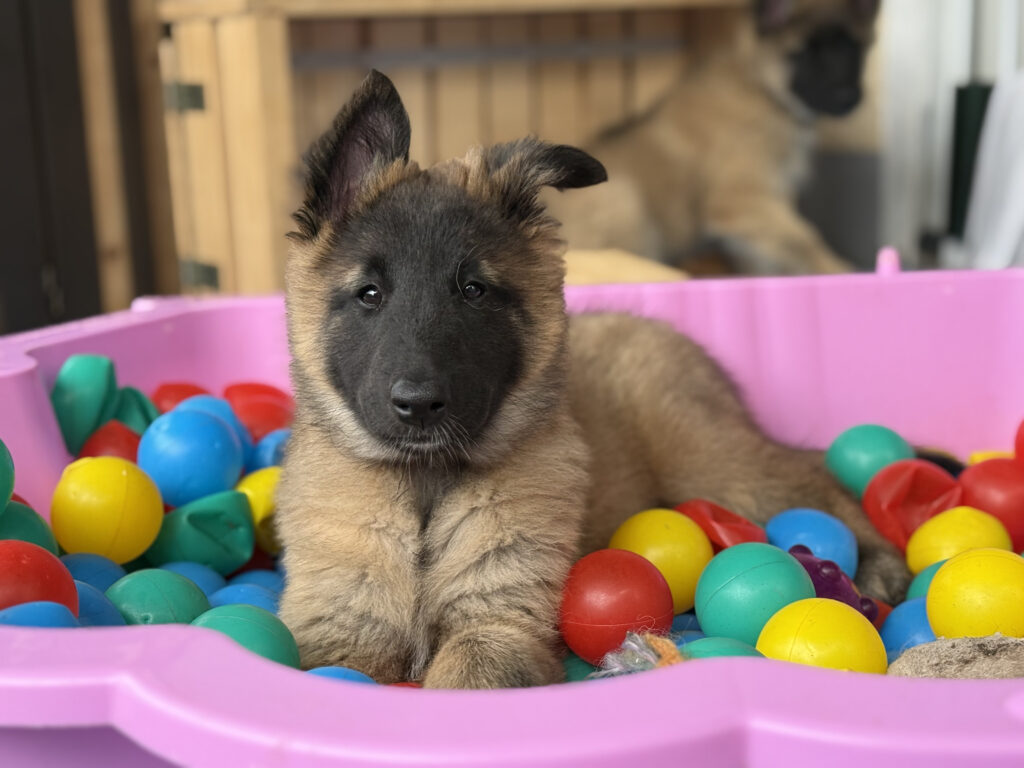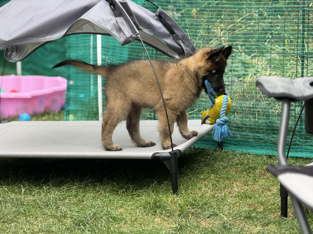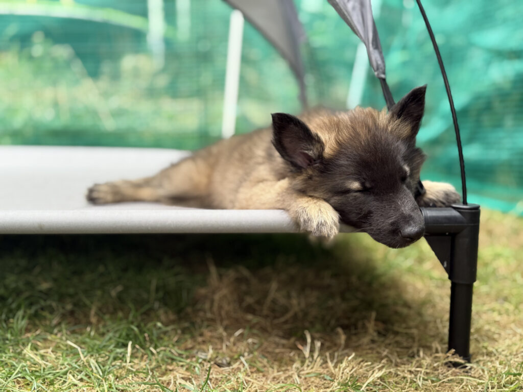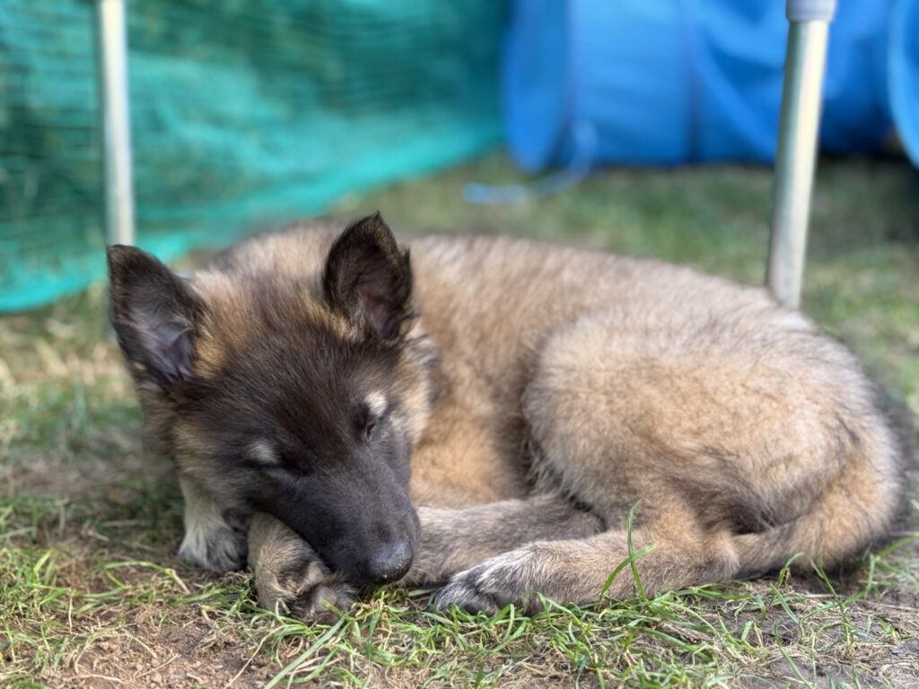 Anfang Mai fuhren wir mit unserer Hündin Camill zum Decken zu Dayo dem auserwählten Deckrüden. Und so wussten wir, dass – sollte die Deckung erfolgreich sein – wir Anfang Juli mit dem Nachwuchs rechnen konnten. Und so war es dann auch. An Tag 65 der Trächtigkeit kamen die Babies unseres B-Wurfs auf die Welt. 8 gesunde Welpen waren von nun an Teil unseres täglichen Lebens. War das Wetter schon vorher sehr sommerlich, so sollten die kommenden 9 Wochen ebenfalls herrlich werden. Anfangs waren die Welpen noch im Wurf-Raum, der direkt an unsere Küche angeschlossen ist, untergebracht. Zum Teil war es auch nachts sehr sehr warm. Dann war es soweit: unser Wurf zog Ende der dritten / Anfang der vierten Woche in das Welpen-Zimmer um. Das Welpen-Zimmer hatten wir in diesem Jahr neu gebaut. Es ist ein Sommer-, bzw. Wintergarten, der auf der einen Seite direkt an unserem Wohnzimmer liegt, andererseits aber auch den direkten Zugang zum Garten hat. Und nachdem die Welpen das erste Mal im Garten waren, wollten sie gar nicht wieder ins Haus. Alle Spielzeuge und Spielgeräte wurden morgens rausgeräumt und abends kamen sie wieder in das Welpen-Zimmer. Da im Prinzip die komplette Welpen-Zeit wettertechnisch die Sonne schien, mussten wir für genügend Schattenplätze sorgen. Die Schattenplätze hatten aber auch noch einen weiteren Vorteil. Denn eine Gefahr, über die wir vorher gar nicht nachgedacht hatten, war das Thema Greifvögel. Spätestens seit dem Moment, als mehrere Greifvögel über unserem Grundstück kreisten, wurden wir uns der Gefahr bewusst. Und diese sorgte dafür, dass sich immer einer von uns bei den Welpen im Garten aufhielt. Und auch die Mahlzeiten wurden dann bei den Welpen eingenommen. Einen realen Schreckmoment erlebten wir dann tatsächlich, als sich ein Greifvogel auf den Ständer unseres Sonnenschirms setzte. Ehrlicherweise rutschte mir in dem Moment das Herz ganz schön in die Hose. Genügend Adrenalin wurde in dem Moment in mir freigesetzt, so dass ich meine Augen tatsächlich danach wieder überall hatte.