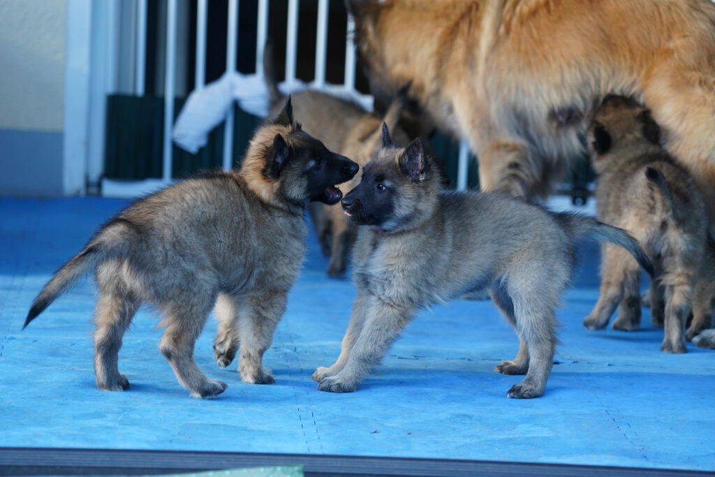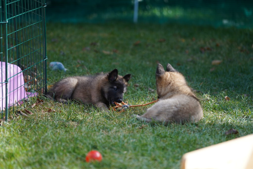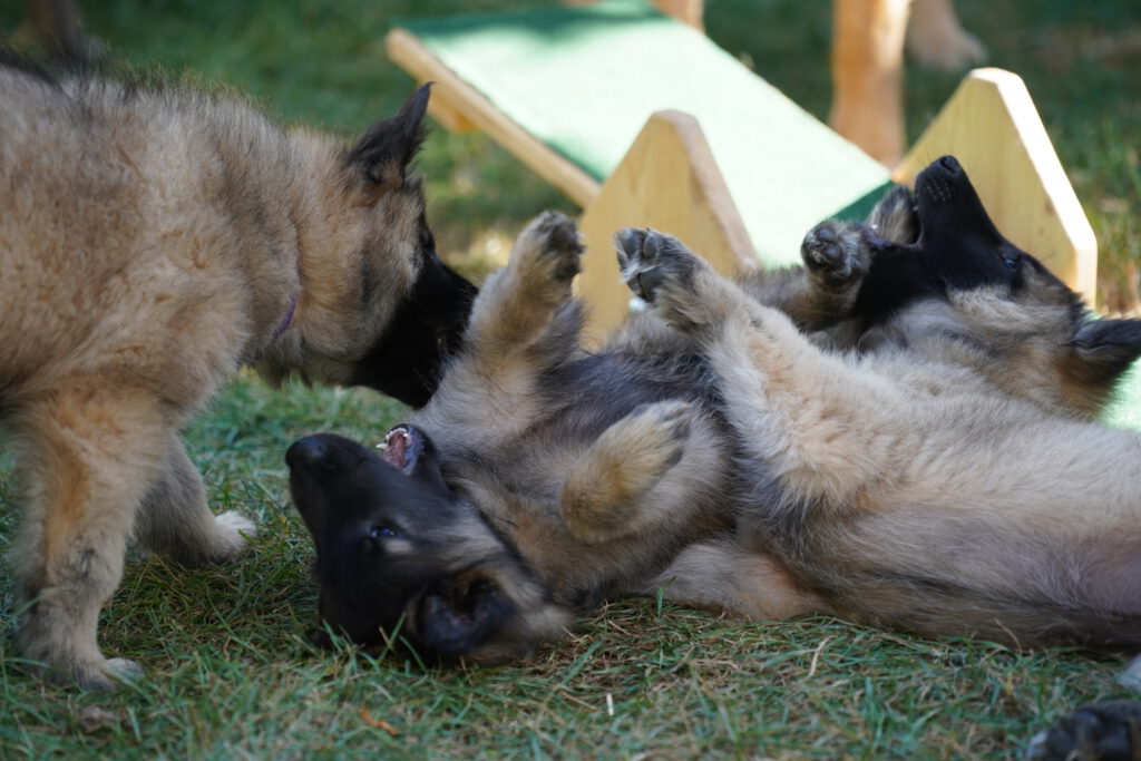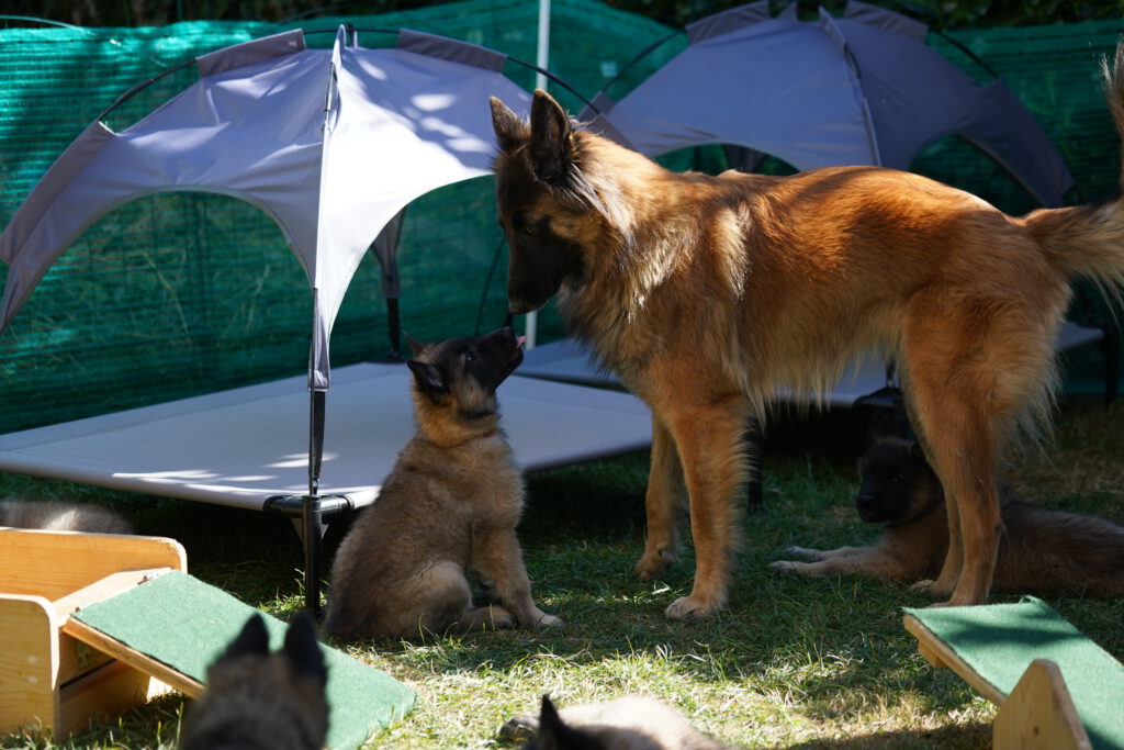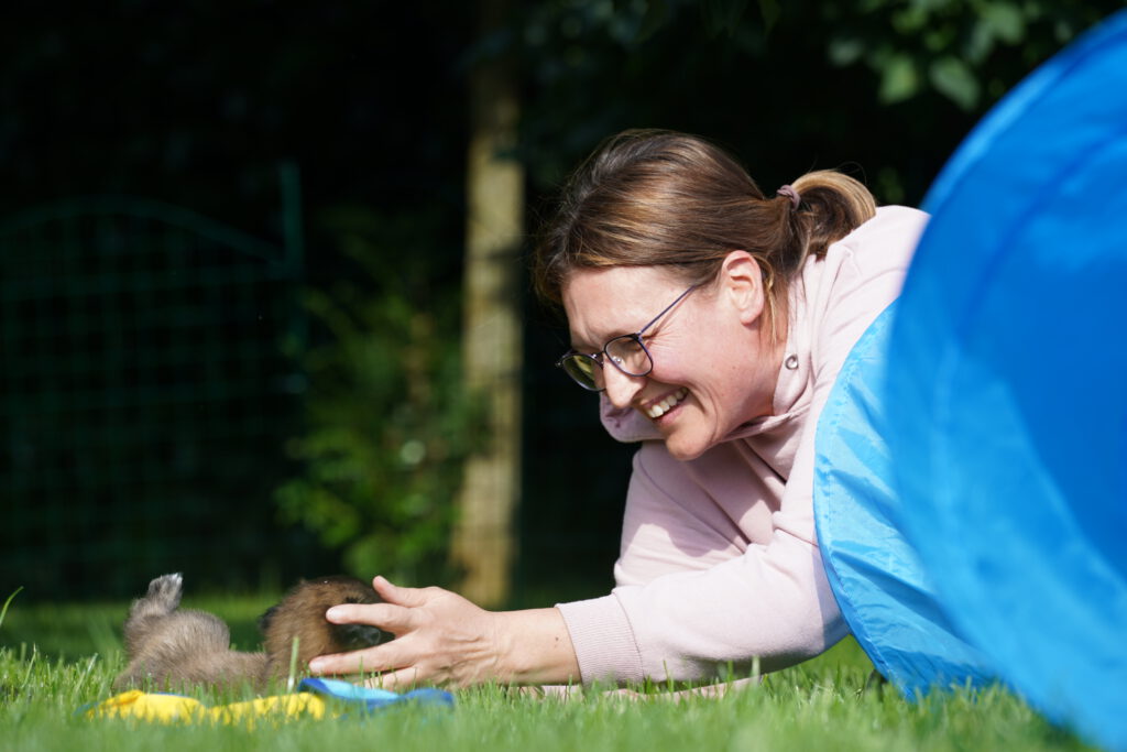 Last, but not least, ist auch die Sozialisierung wichtig, die die Hunde untereinander erleben. Das bedeutet, das Interagieren der Welpen unter- und miteinander ist wichtig. Hier lernen die Welpen hündisches Verhalten und Kommunizieren kennen. Natürlich spielt dabei auch die Mutter-Hündin eine wesentliche Rolle, denn sie bringt den kleinen Hunden die Grundlagen bei, und versucht Ihnen Sicherheit zu vermitteln. Bei uns spielt dann auch „der Rest des Rudels“ eine nicht unerhebliche Rolle, denn auch der Kontakt zu noch jugendlichen aber vor allem auch weiteren erwachsenen Hunden ist hilfreich für die Entwicklung. Selbstverständlich sind wir bei diesen Kontakten immer dabei, so dass wir im Notfall eingreifen können, und nichts „aus dem Ruder läuft“. Denn das Lernen hündischer Verhaltensweisen und Kommunikation ist wichtig, aber schlechte Erfahrungen sollen die Welpen dabei nicht machen.