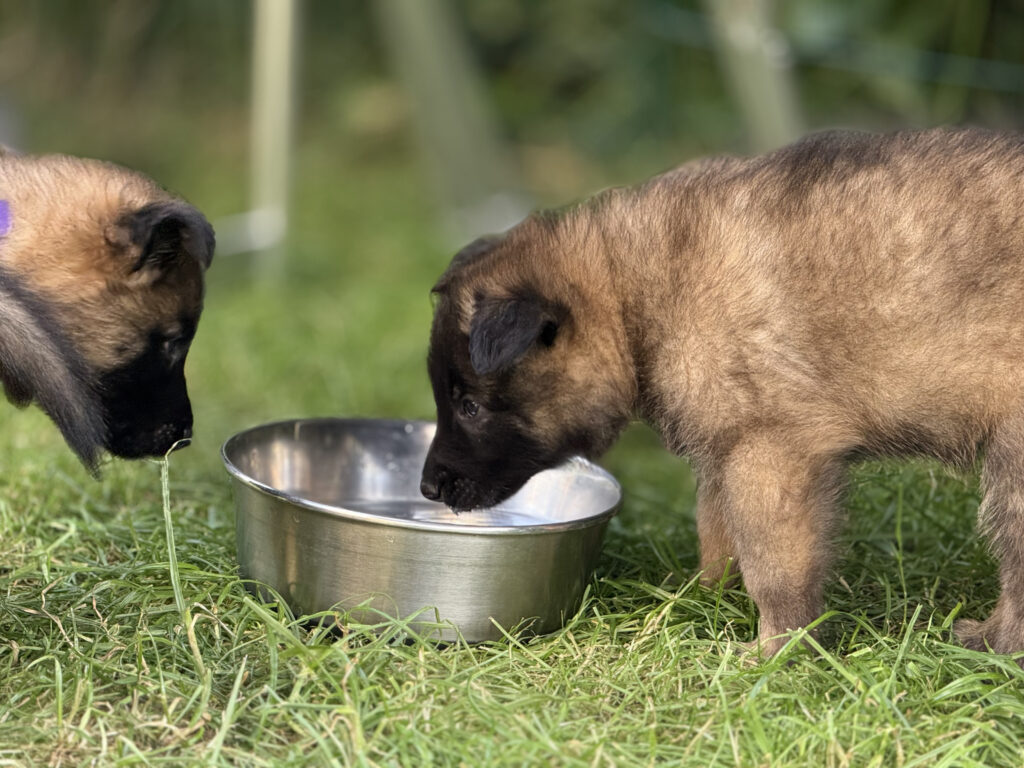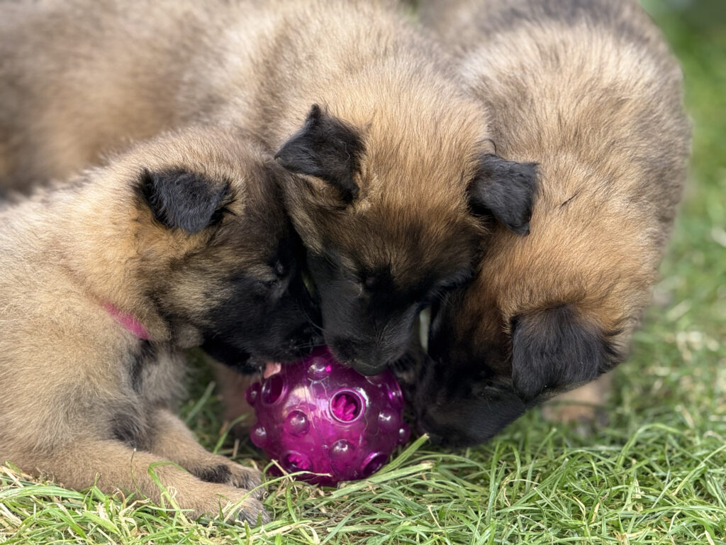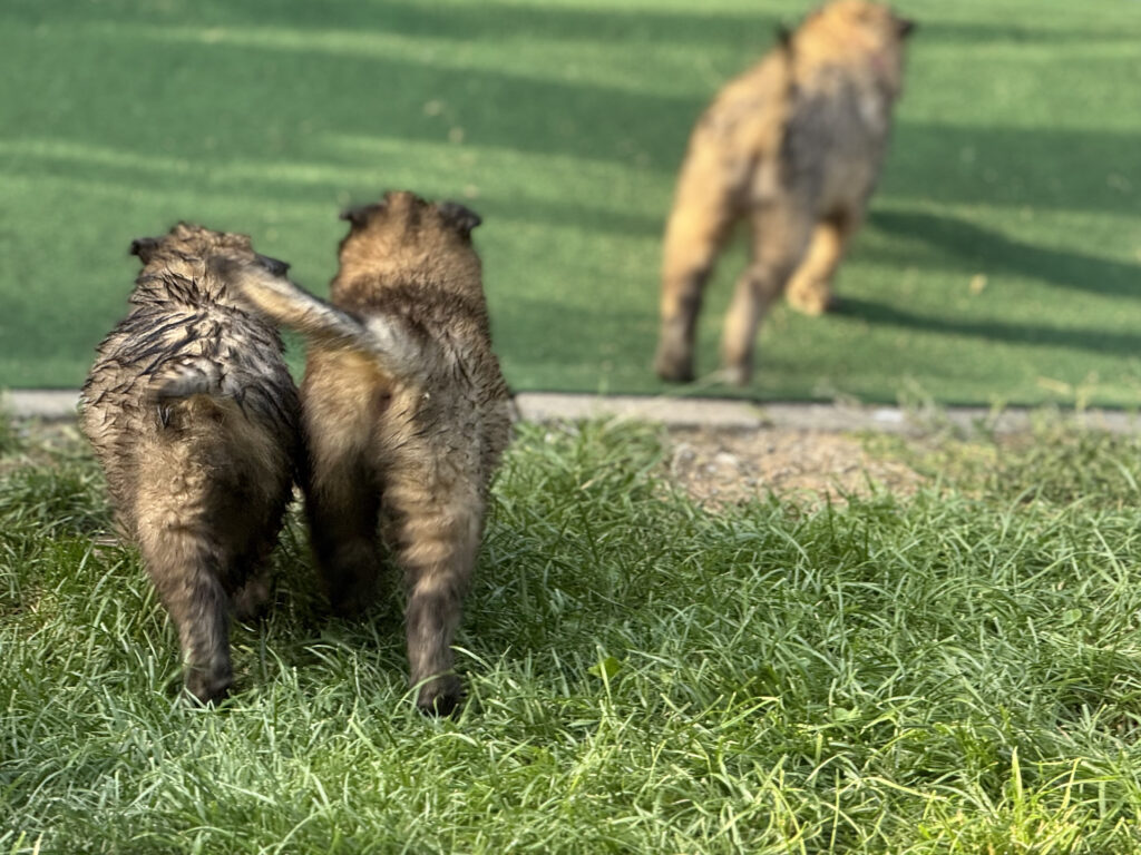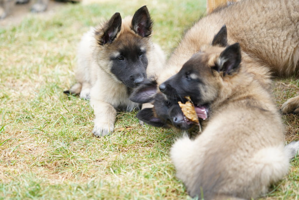 Last, but not least, ist auch die Sozialisierung wichtig, die die Hunde untereinander erleben. Das bedeutet, das Interagieren der Welpen unter- und miteinander ist wichtig. Hier lernen die Welpen hündisches Verhalten und Kommunizieren kennen. Natürlich spielt dabei auch die Mutter-Hündin eine wesentliche Rolle, denn sie bringt den kleinen Hunden die Grundlagen bei, und versucht Ihnen Sicherheit zu vermitteln. Bei uns spielt dann auch „der Rest des Rudels“ eine nicht unerhebliche Rolle, denn auch der Kontakt zu noch jugendlichen aber vor allem auch weiteren erwachsenen Hunden ist hilfreich für die Entwicklung. Selbstverständlich sind wir bei diesen Kontakten immer dabei, so dass wir im Notfall eingreifen können, und nichts „aus dem Ruder läuft“. Denn das Lernen hündischer Verhaltensweisen und Kommunikation ist wichtig, aber schlechte Erfahrungen sollen die Welpen dabei nicht machen.
