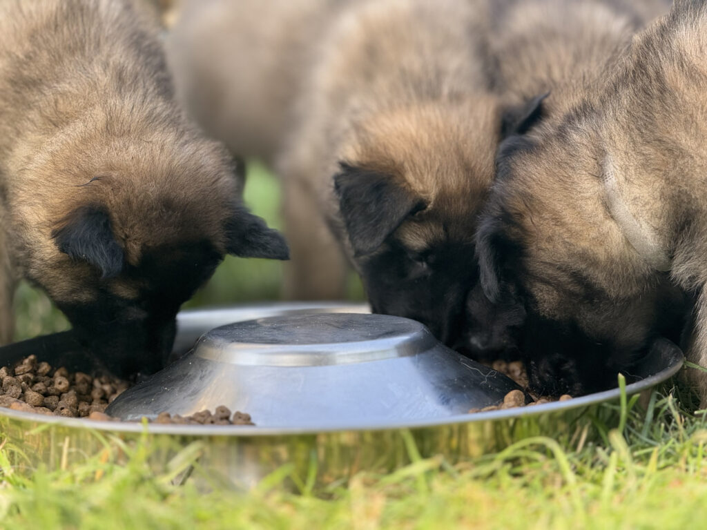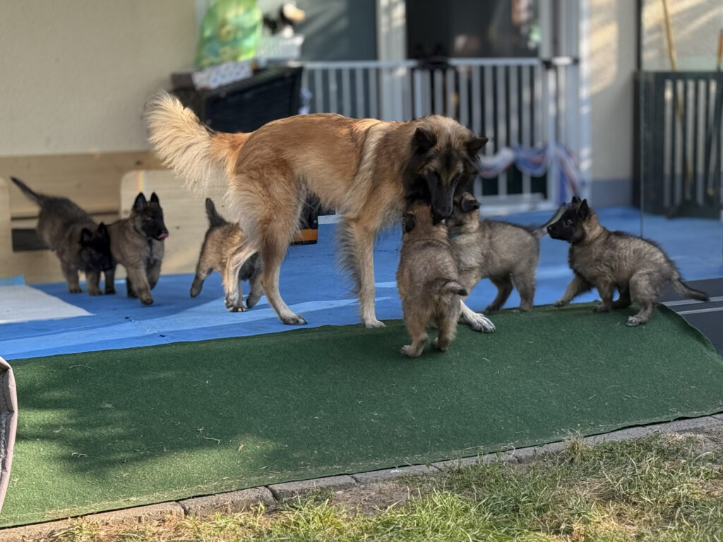 Ganz wichtig in diesem Zusammenhang ist auch, dass die kleinen Welpen während ihrer Zeit bei uns immer Kontakt zu ihrer Mutter haben. Denn auch das kennen wir aus unserer langjährigen Erfahrung als Hundehalter: wenn Welpen zu früh von ihrer Mutter getrennt werden, dann fehlt ihnen ein gewisser Teil ihrer Erziehung. Auch die Mutter-Hündin bereitet ihre Kinder auf einiges im Leben vor, so dass die jungen Hunde ein Stück weit Sicherheit erlangen. Fehlt den Welpen die Mutter oder auch nur ein Teil der Zeit mit ihrer Mutter kann das dafür sorgen, dass die Hunde in ihrem Sozialverhalten unsicher sind. Dies ist dann nur mit Kraftanstrengung und Aufwendung von Zeit durch den Hundebesitzer später in zumeist mühevoller Kleinarbeit wieder zu korrigieren. Hier benötigen die Halter dann viel Geduld. Sollten die Welpen, aus welchen Gründen auch immer, ohne Mutter aufwachsen (müssen), so kann man natürlich Glück haben, und eine andere Hündin im Rudel übernimmt diese Aufgabe. Hat es aber nur die Mutter-Hündin gegeben, dann wird der Züchter versuchen, die Aufgaben der Mutter weitestgehend zu übernehmen.